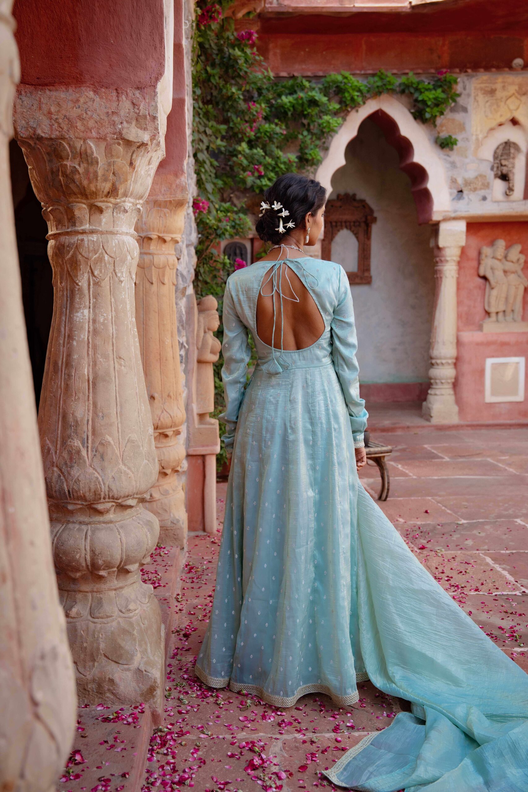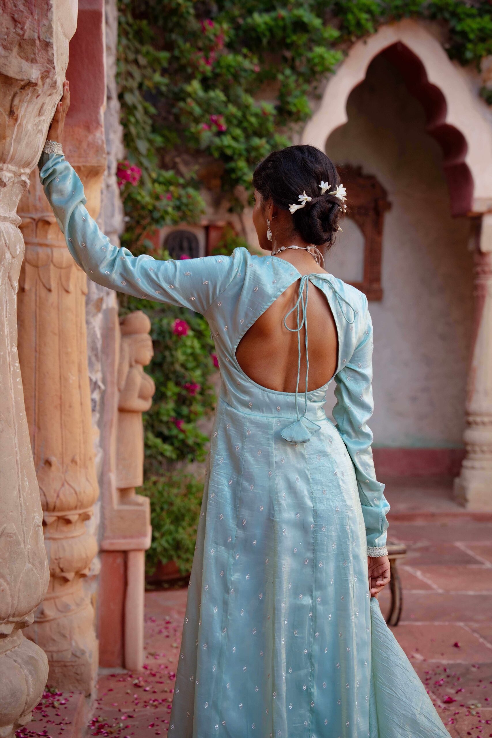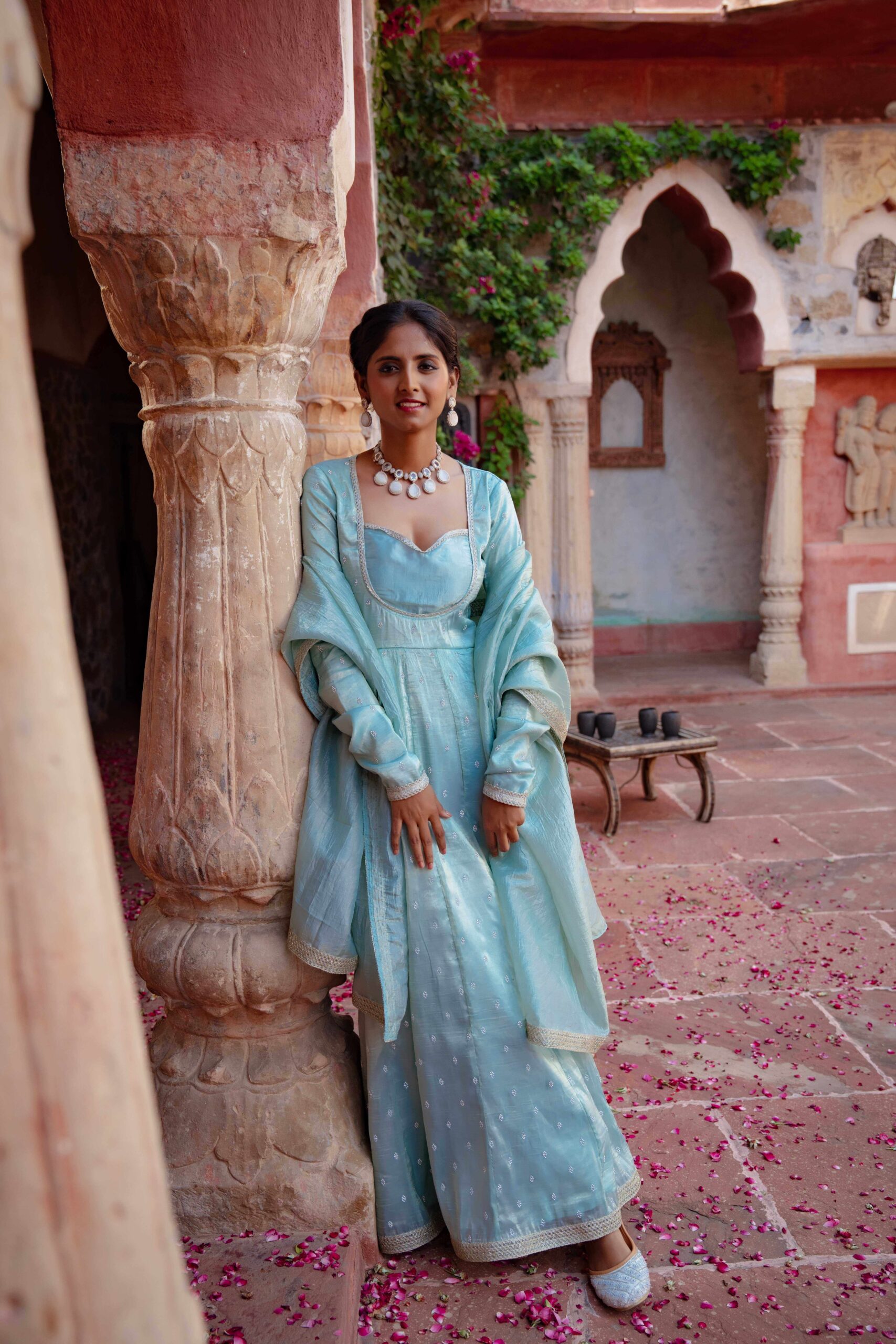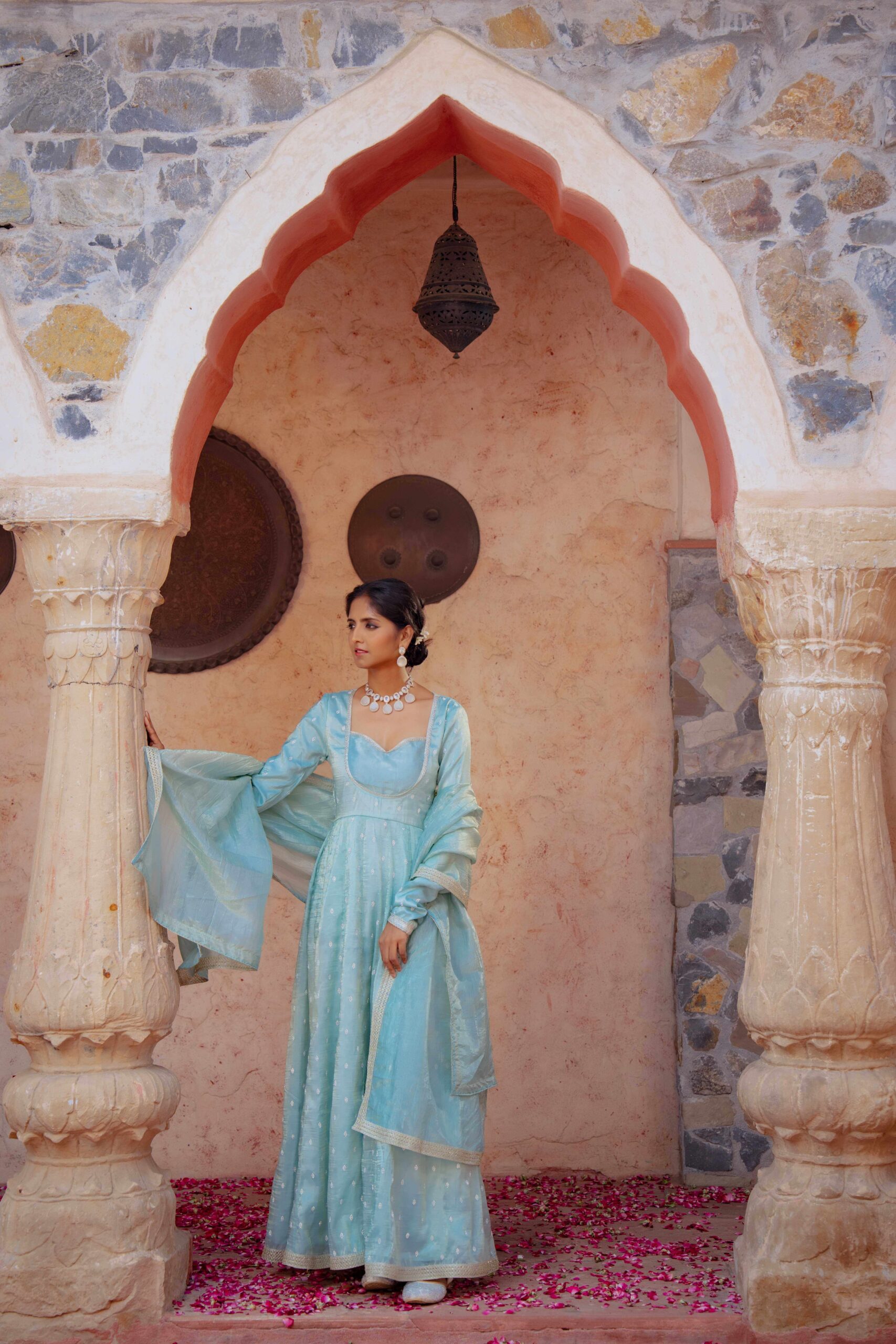 Drape yourself in ethereal charm with this pastel blue tissue Anarkali, exquisitely highlighted with delicate Zarkan embroidery. The graceful neckline adds timeless elegance, while the deep back cut with tie-up detailing lends a touch of allure. Embellished with fine lace trims along the hem and sleeves, the ensemble is elevated with a complementing dupatta featuring a lace border that enhances its sophistication. The luxurious blue hue paired with the subtle shimmer of tissue fabric creates a rich, regal look—perfect for festive soirées and wedding celebrations.