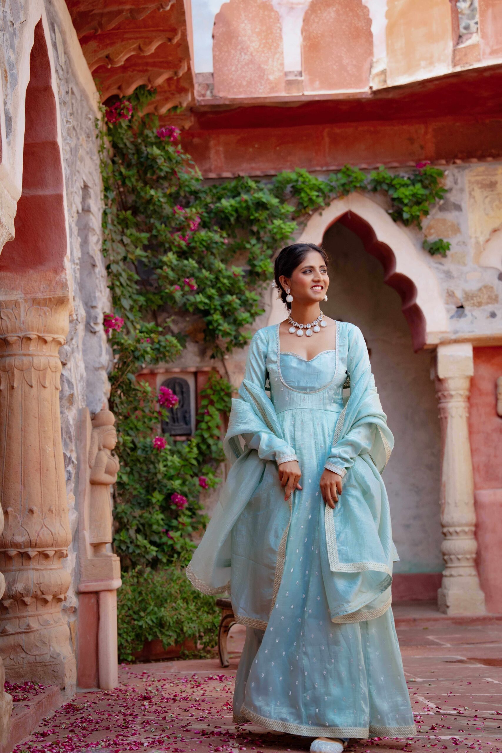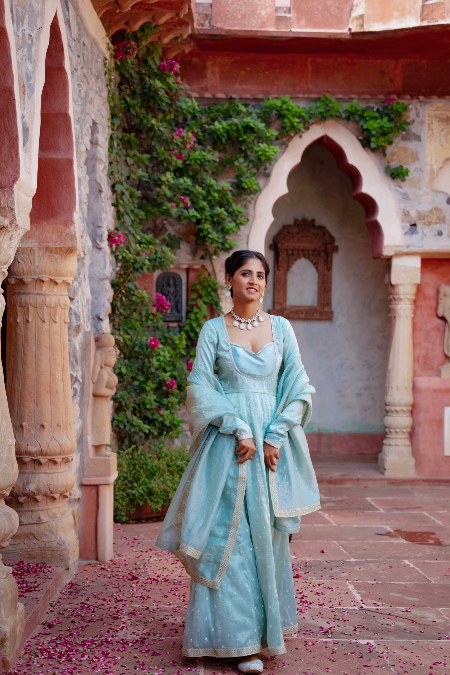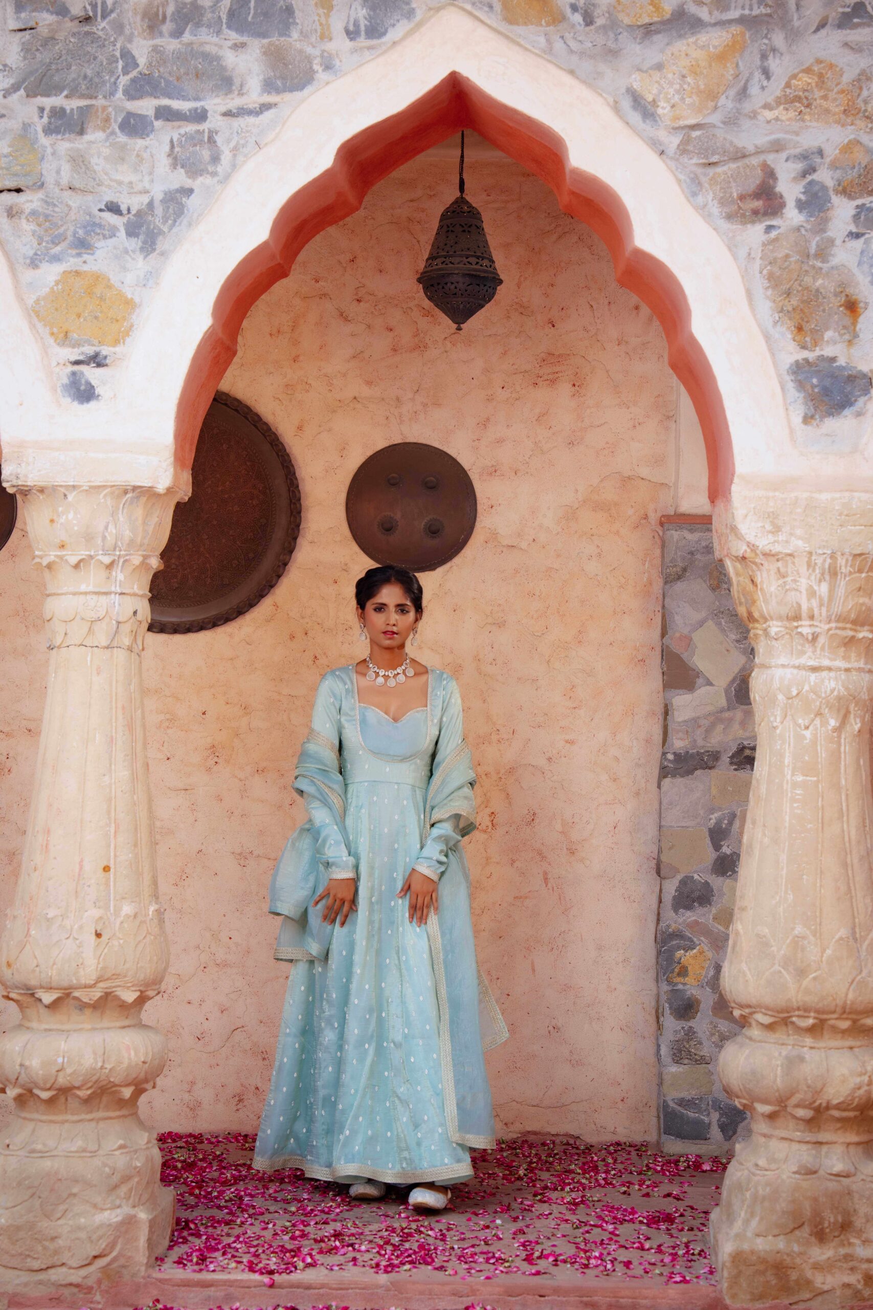 Drape yourself in ethereal charm with this pastel blue tissue Anarkali, exquisitely highlighted with delicate Zarkan embroidery. The graceful neckline adds timeless elegance, while the deep back cut with tie-up detailing lends a touch of allure. Embellished with fine lace trims along the hem and sleeves, the ensemble is elevated with a complementing dupatta featuring a lace border that enhances its sophistication. The luxurious blue hue paired with the subtle shimmer of tissue fabric creates a rich, regal look—perfect for festive soirées and wedding celebrations.