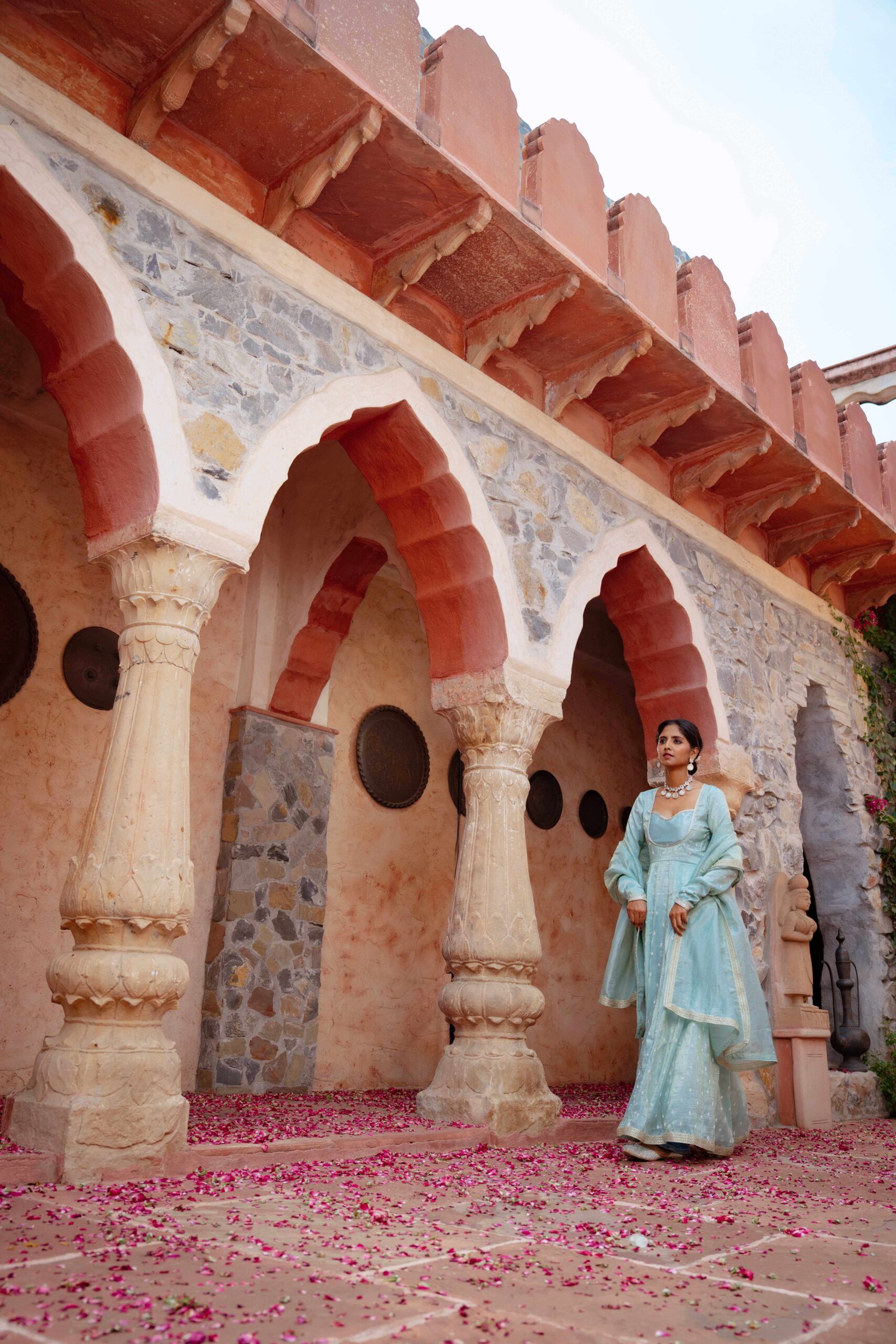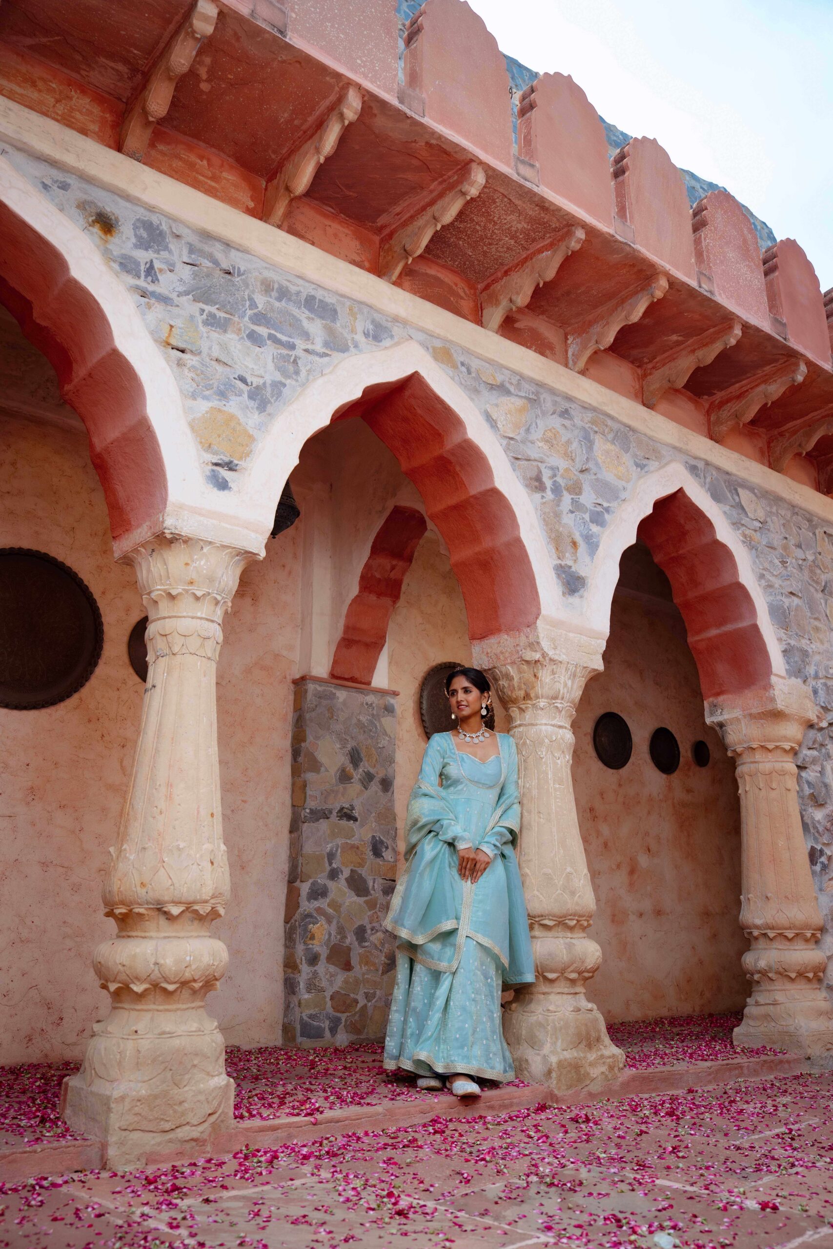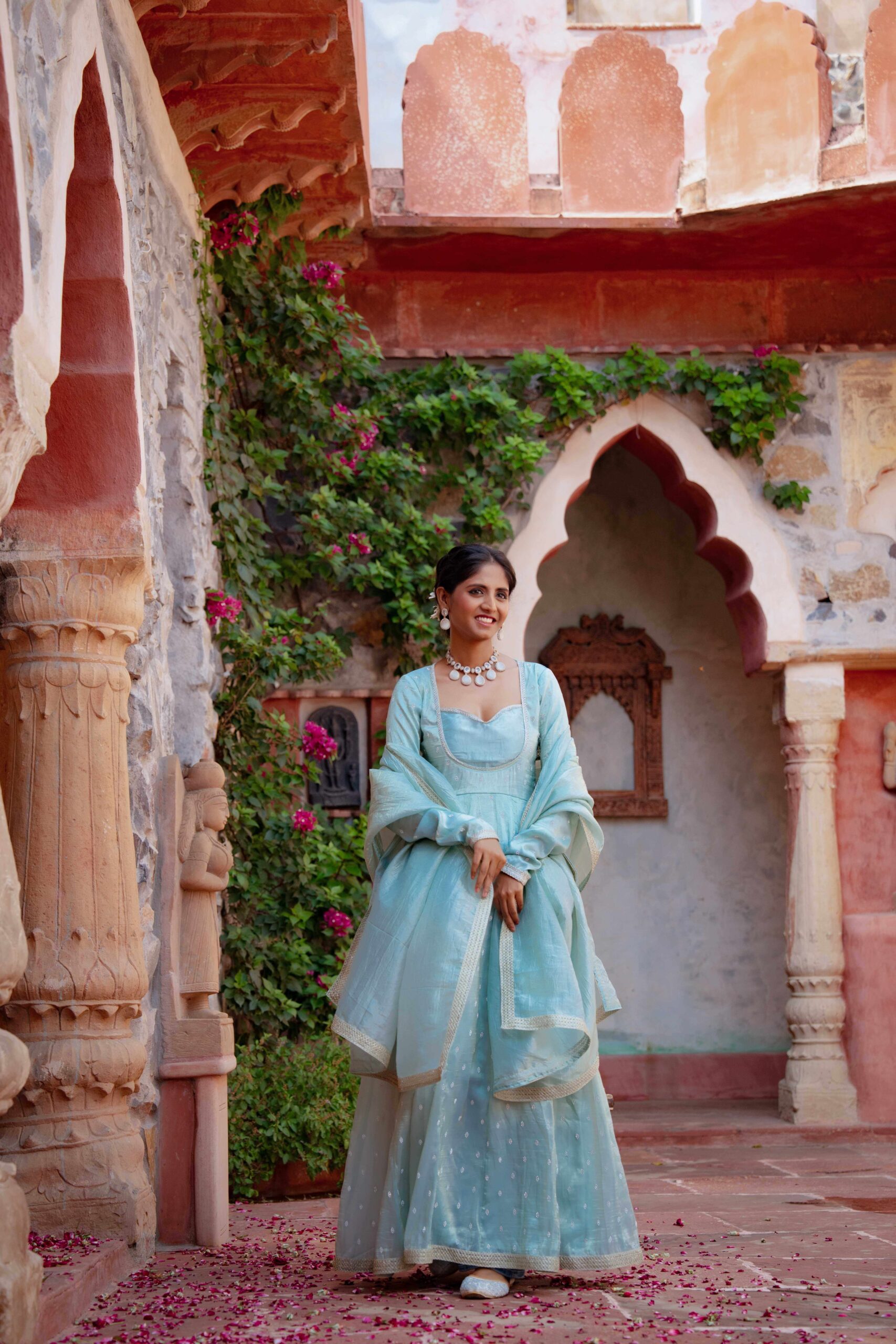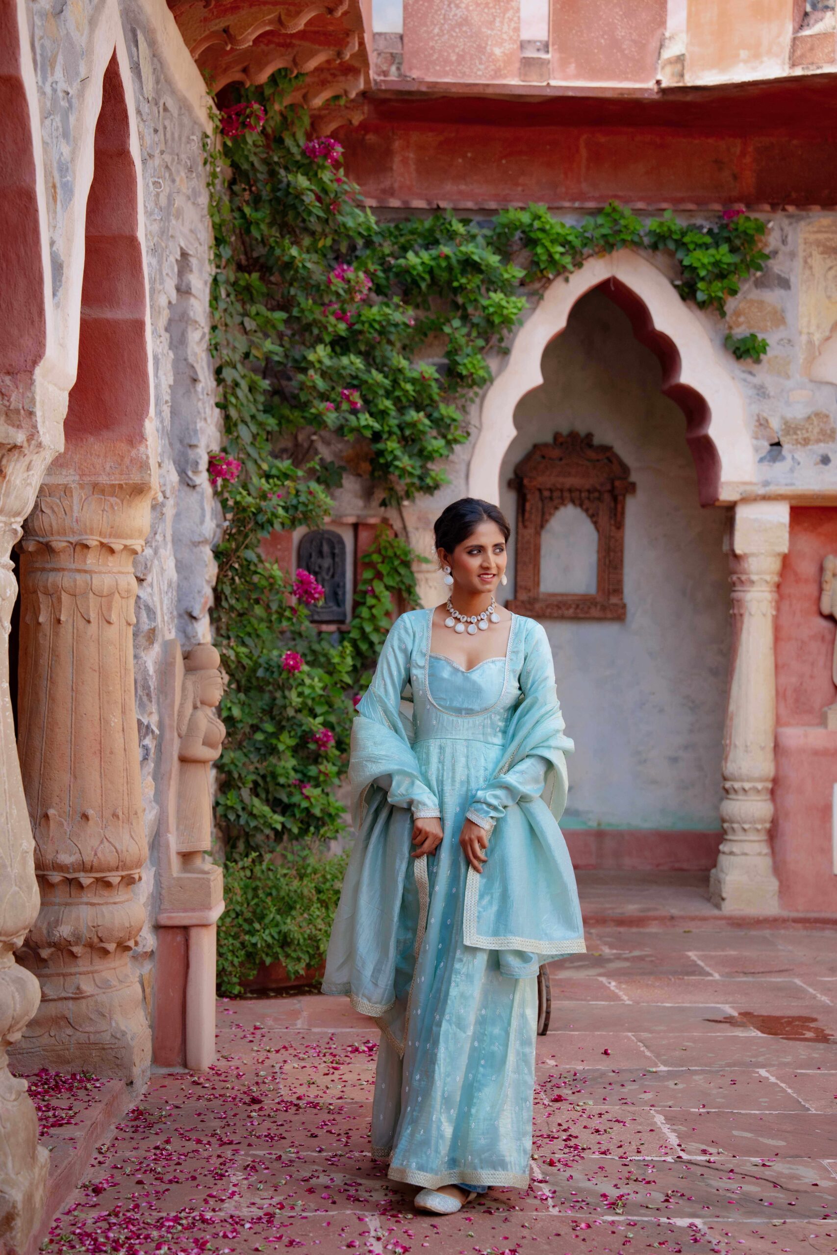 Drape yourself in ethereal charm with this pastel blue tissue Anarkali, exquisitely highlighted with delicate Zarkan embroidery. The graceful neckline adds timeless elegance, while the deep back cut with tie-up detailing lends a touch of allure. Embellished with fine lace trims along the hem and sleeves, the ensemble is elevated with a complementing dupatta featuring a lace border that enhances its sophistication. The luxurious blue hue paired with the subtle shimmer of tissue fabric creates a rich, regal look—perfect for festive soirées and wedding celebrations.