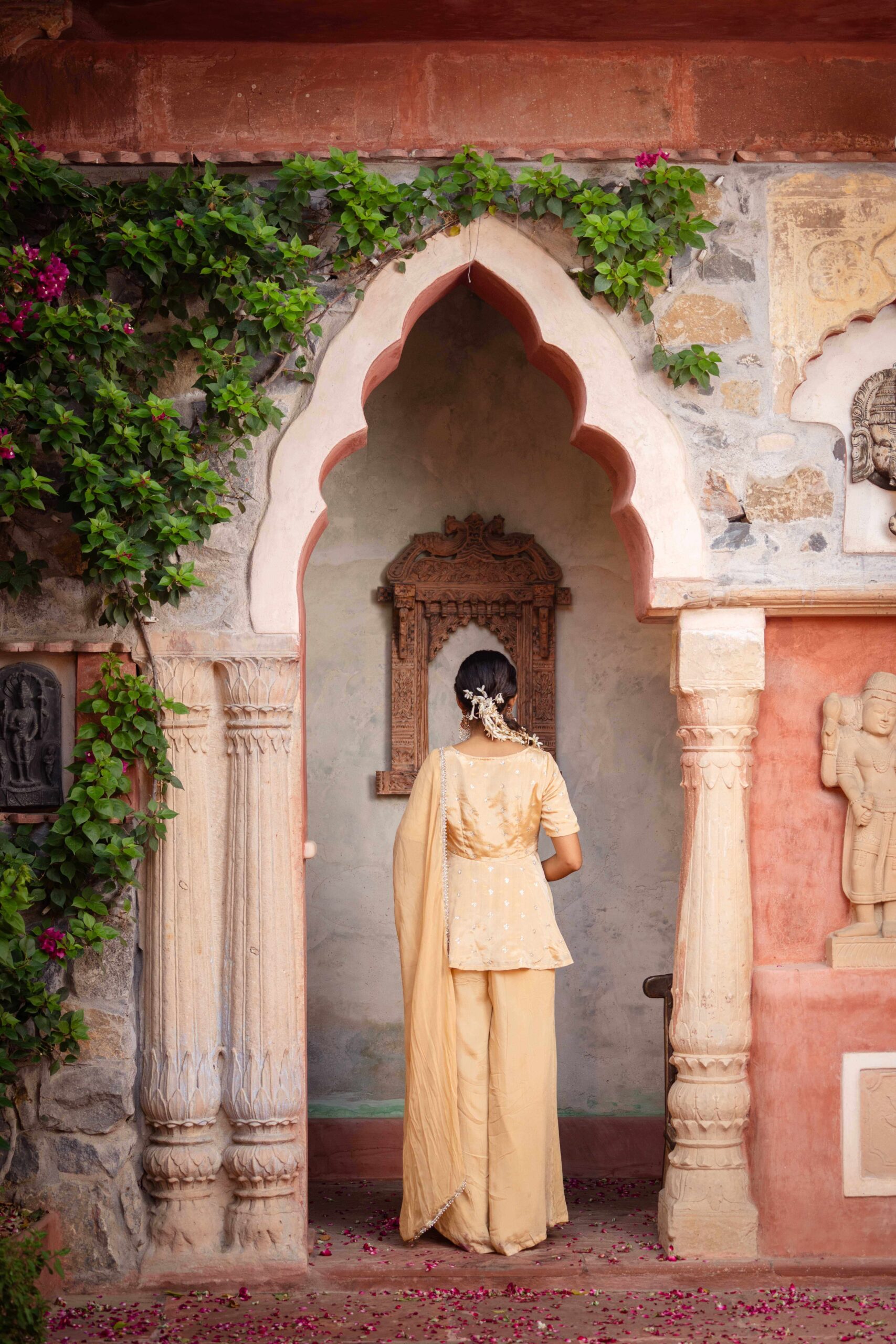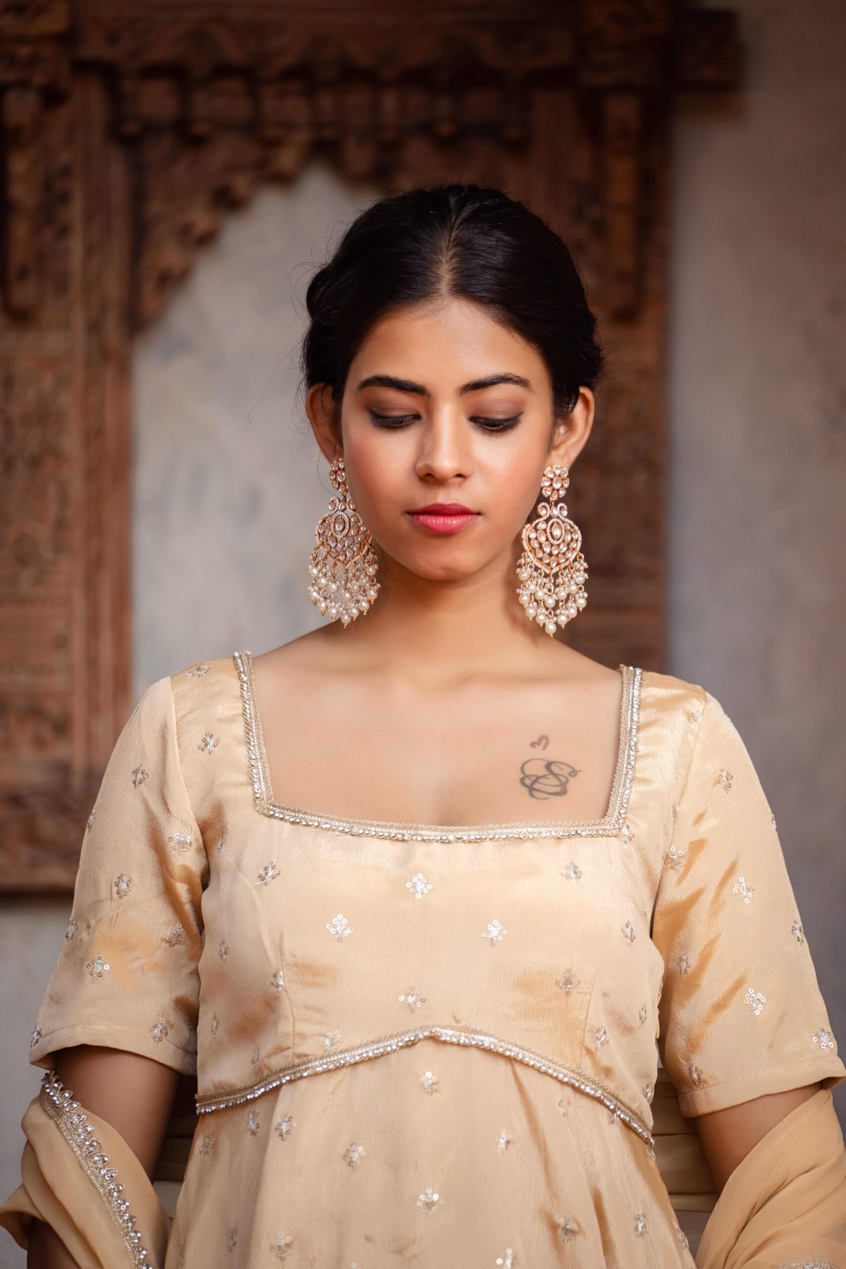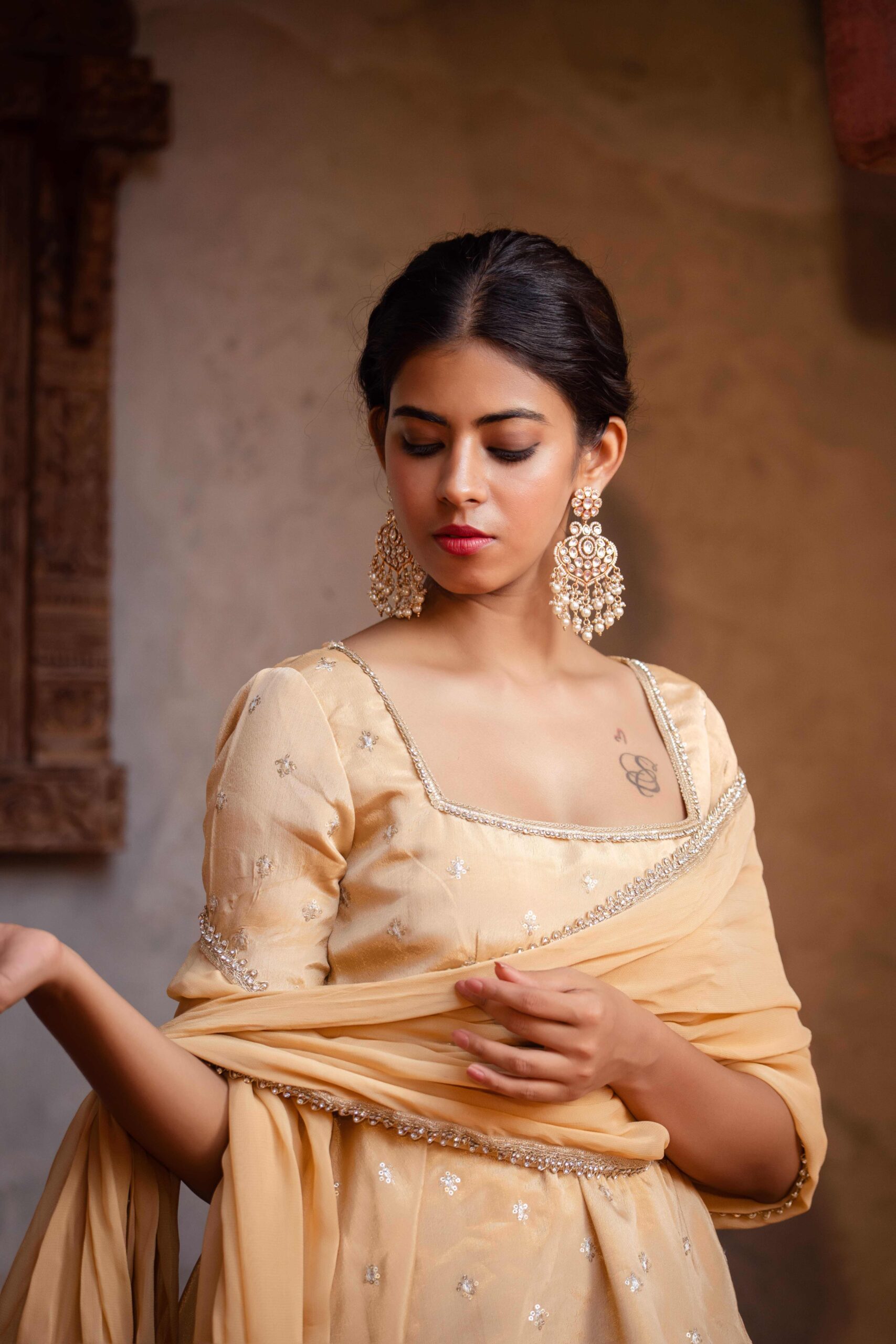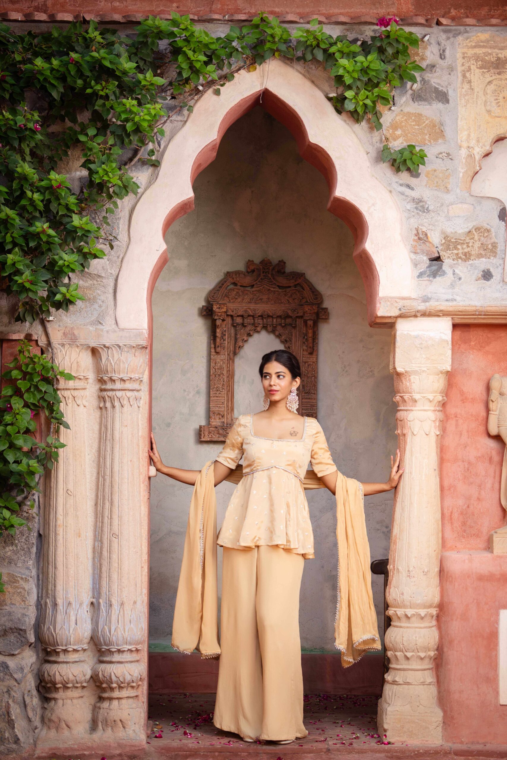 Elevate your festive elegance with this soft beige peplum-kurta set, crafted in luxurious chinon and adorned with delicate embroidered motifs. The square neckline and structured bodice create a refined silhouette, while the gently flared peplum adds a graceful, feminine charm. Paired with flowy palazzo pants for effortless comfort and movement, the look is completed with a matching dupatta finished with intricate lace edging for a subtle touch of sparkle. Perfect for celebrations and special occasions, this ensemble beautifully blends modern simplicity with traditional finesse.