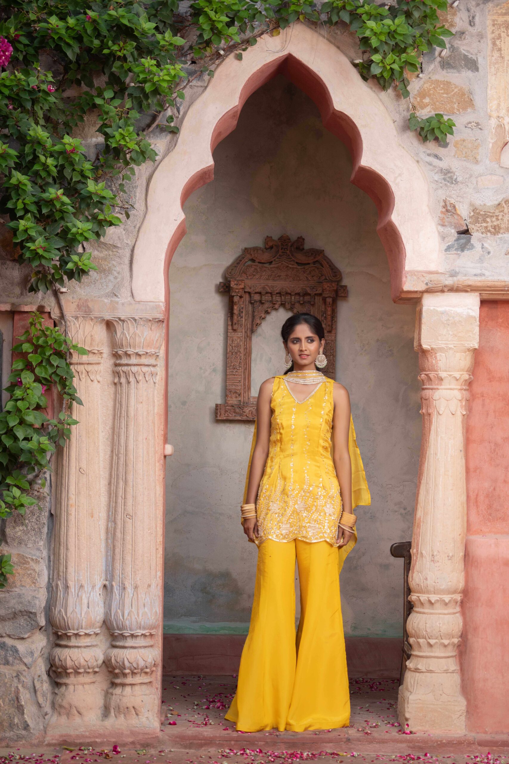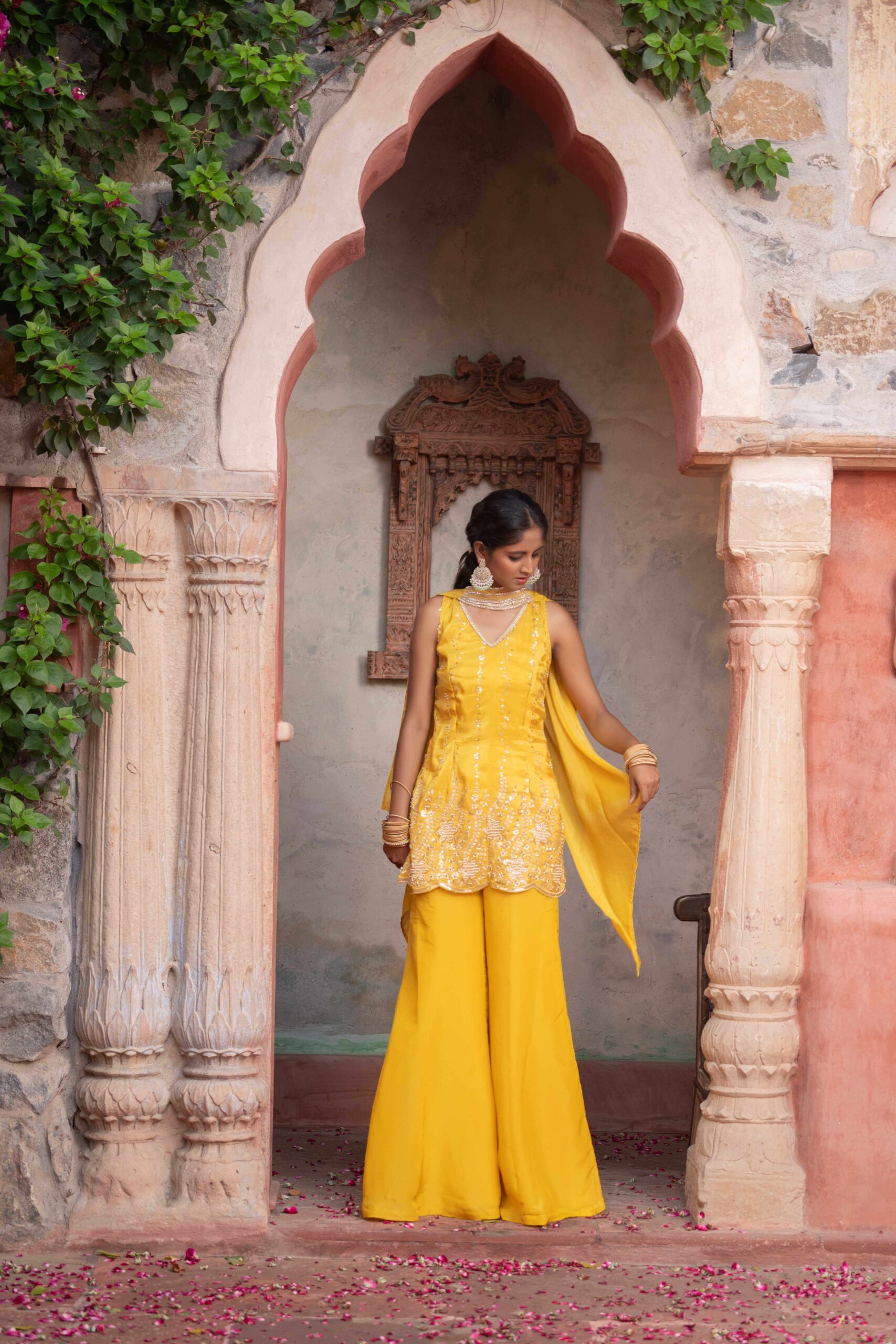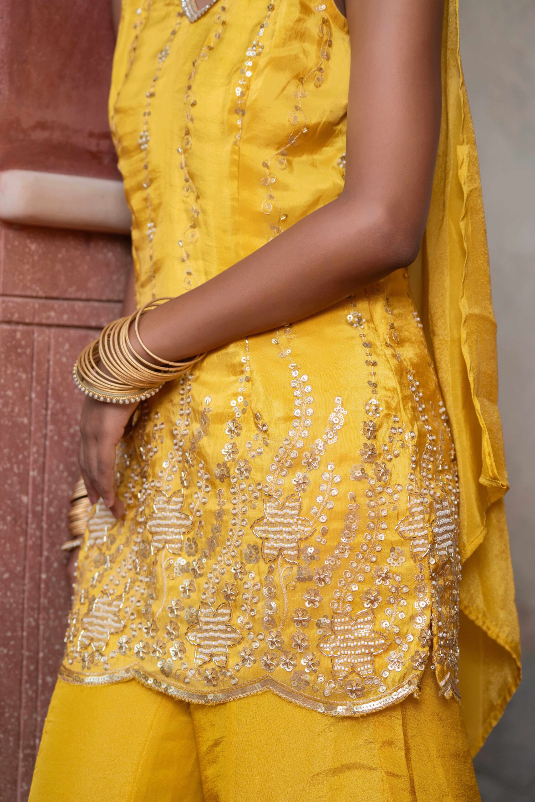 Yellow sharara set, crafted in luxurious fabric and adorned with intricate sequins and thread embroidery. The short kurta features a graceful V-neckline and scalloped embroidered hem, adding a delicate feminine touch. Paired with wide-legged sharara pants that flow effortlessly with every step, the ensemble brings together comfort and elegance in perfect harmony. The lightweight dupatta drapes beautifully, completing the look with subtle sophistication. Ideal for festive gatherings, haldi ceremonies, and joyous occasions, this outfit is a radiant blend of tradition and contemporary charm.