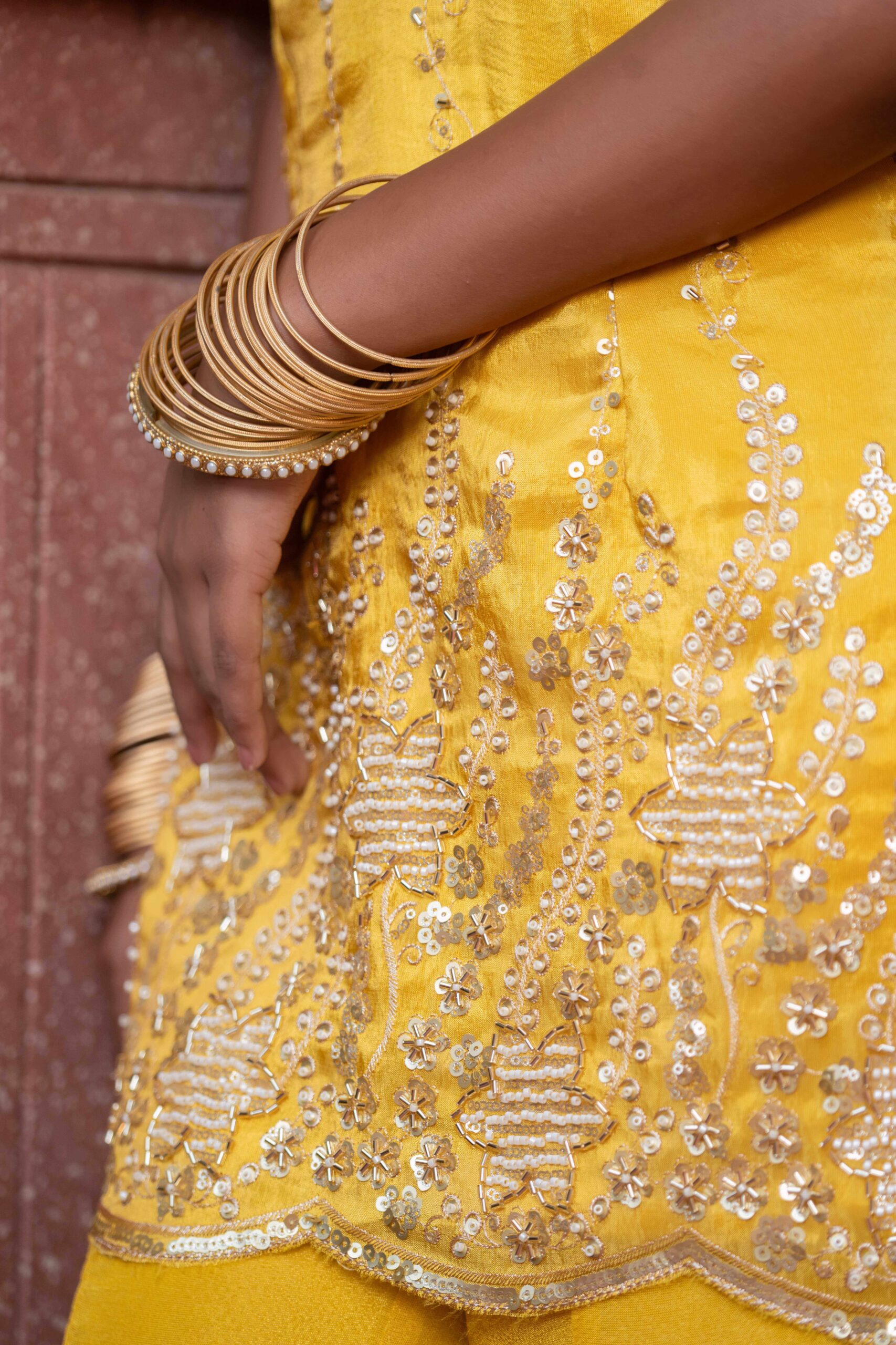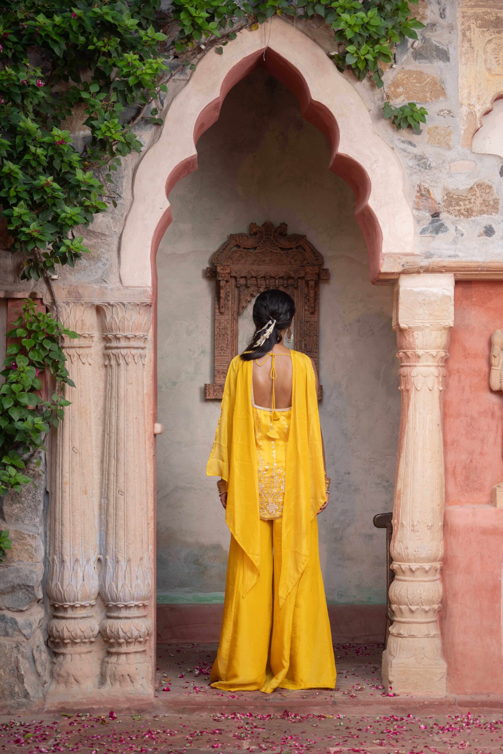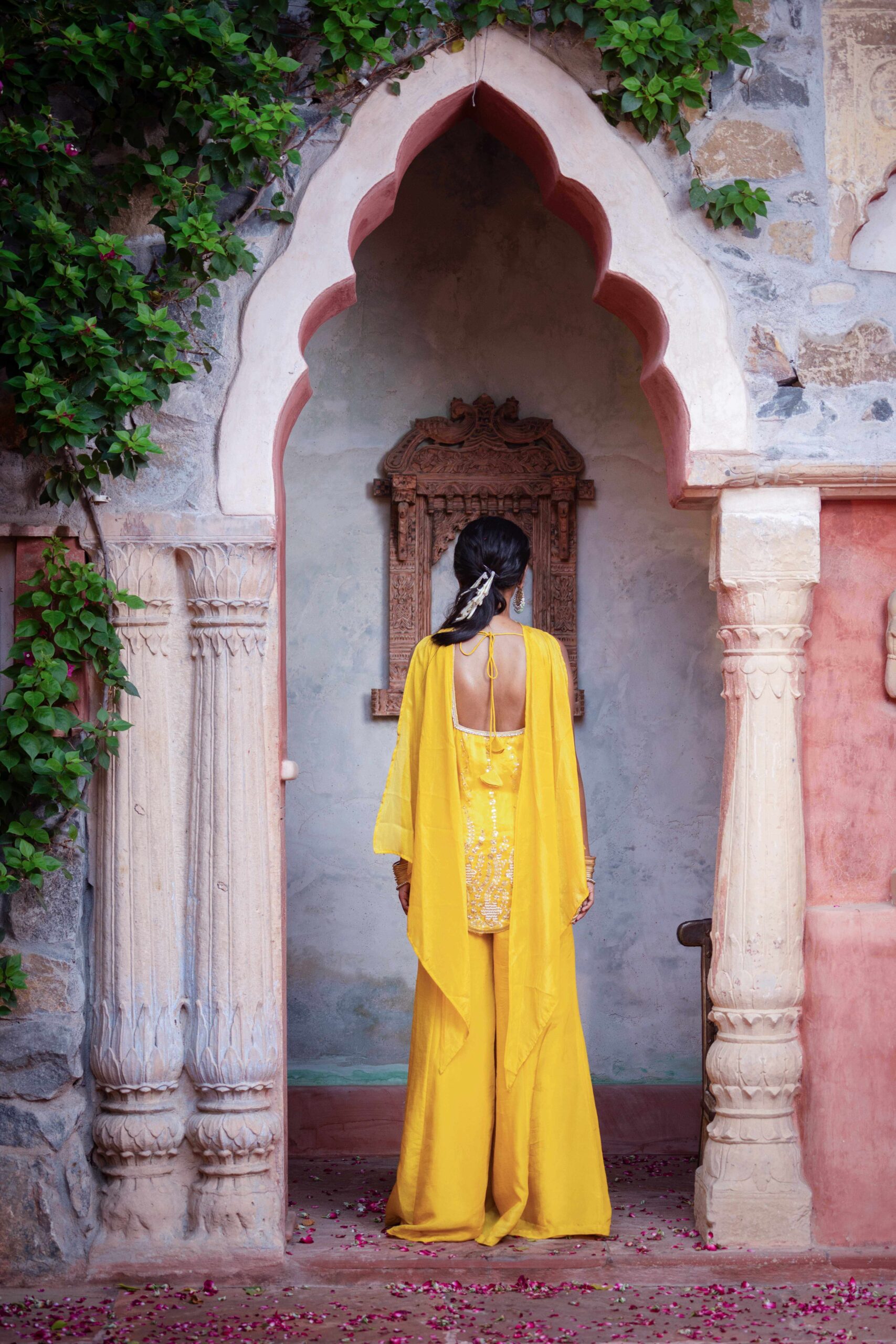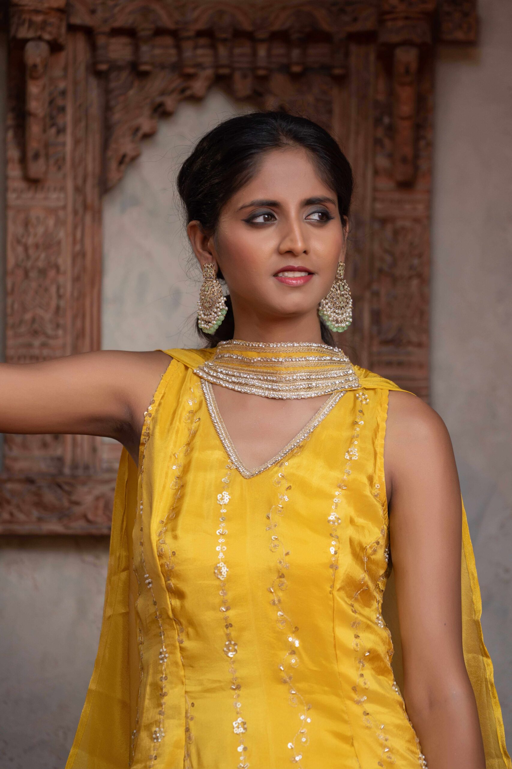 Yellow sharara set, crafted in luxurious fabric and adorned with intricate sequins and thread embroidery. The short kurta features a graceful V-neckline and scalloped embroidered hem, adding a delicate feminine touch. Paired with wide-legged sharara pants that flow effortlessly with every step, the ensemble brings together comfort and elegance in perfect harmony. The lightweight dupatta drapes beautifully, completing the look with subtle sophistication. Ideal for festive gatherings, haldi ceremonies, and joyous occasions, this outfit is a radiant blend of tradition and contemporary charm.
